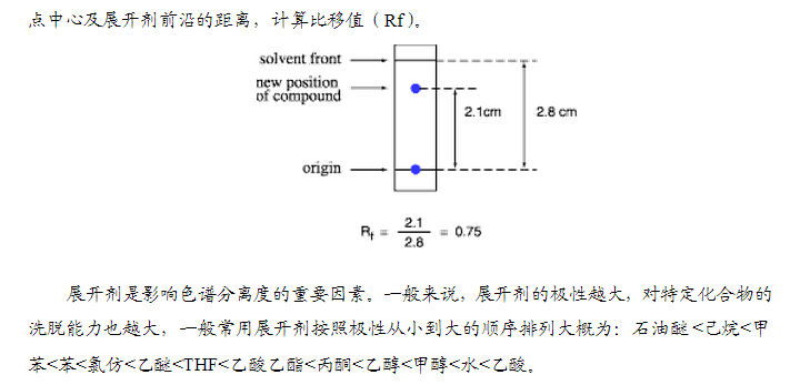 一個(gè)化合物在吸附劑上移動(dòng)的距離與展開劑在吸附劑上移動(dòng)的距離的比值稱為該化合物比移值Rf