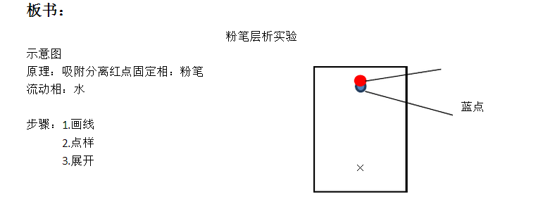 一、學習者已有的知識水平和能力基礎:1、對紙層析分離的原理,步驟等都已掌握,且有較好的知識應用和拓展能力。2、具有較好的理解、分析能力,能舉一反三 二、學習者可能遇到的困難和問題:易與紙層析法的原理混為一談,認為兩者原理是一樣的,其實不然,紙層析是分配分離,而粉筆層析是吸附分離;固定相和流動相不易確定。 教學重點:粉筆層析的分離原理和實驗操作 教學難點:紙層析法與粉筆層析法的比較